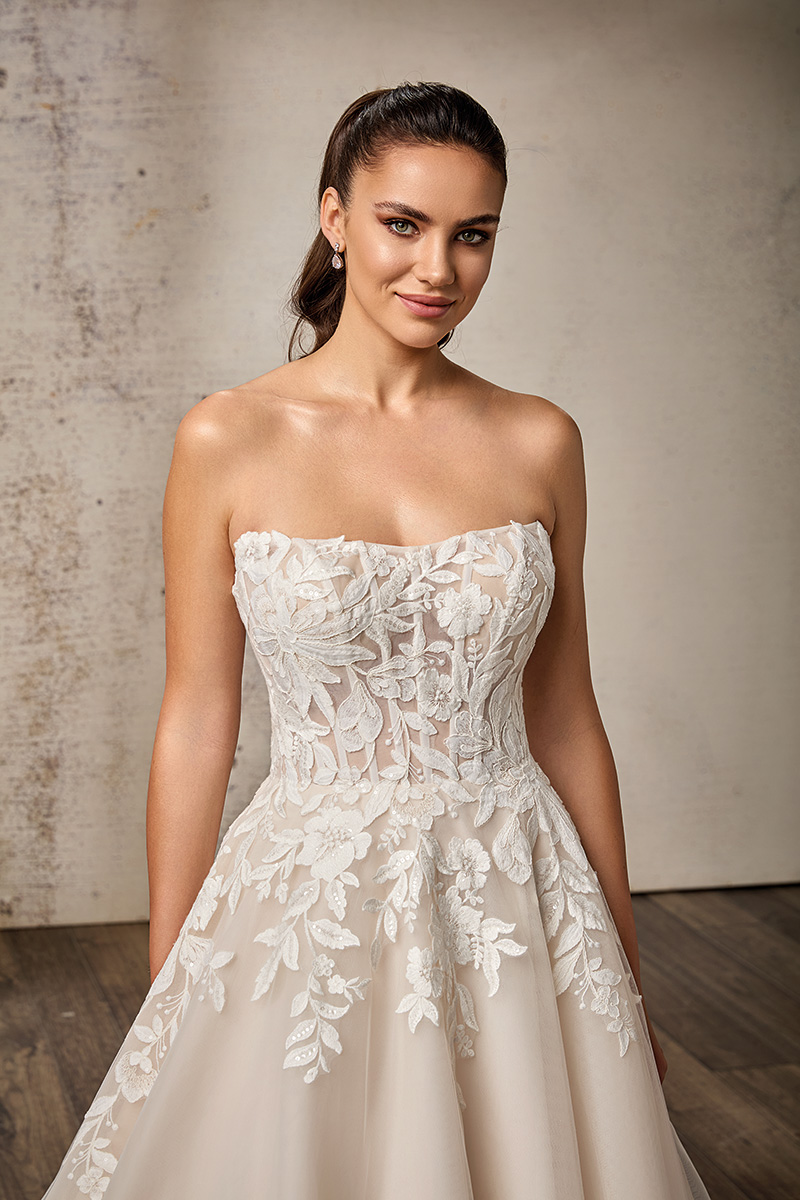 - Best for: Virtually every body type! A-line gowns are famously easy to wear and incredibly flattering, as they highlight the waist and flow gracefully over the hips.